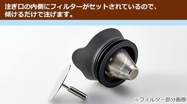 | 素材・材質 | ●フタ・フィルター:ステンレス(中国製) ●パッキン・グリップ:シリコーンゴム(日本製) ●ガラスデカンタ:耐熱ガラス(日本製) |