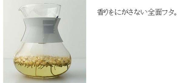 | ホットティー用のポットです。ワインデカンタのようなフォルムなので、食事に合わせてお茶をお楽しみください。注ぎ口にフィルターがセットされていて、傾けるだけで注げるフタとなっています。 |