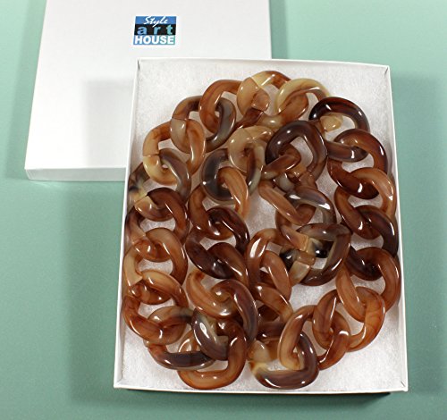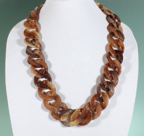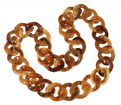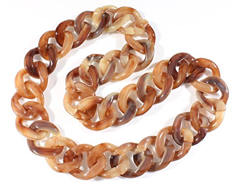 Acrylic beads in a tortoise shell color are linked together to form a funky chunky necklace; the links have swirls of color in them