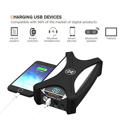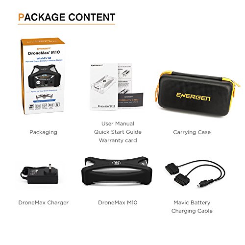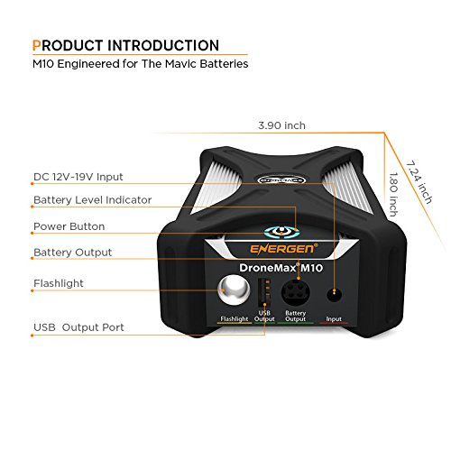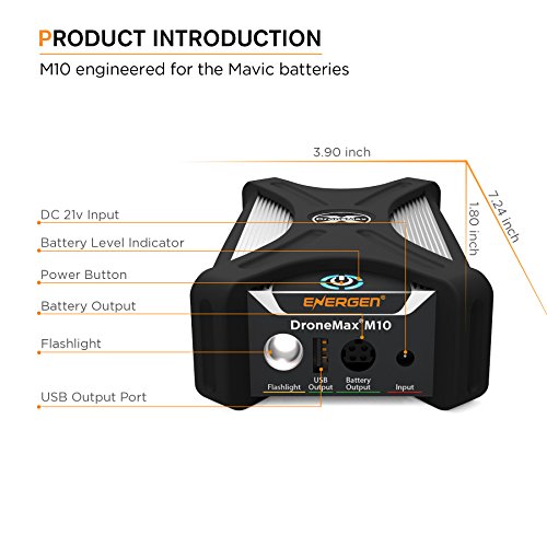 Studio : Energen Publisher : Energen Binding : Misc. Product Description With Energen 4 Ports(USB Output, Battery Output, DC 12V-19V Input, Flashlight) charging devices is quicker and easier, thanks to many powerful features such as Qualcomm Quick Charge 3.0 technology, 66 Watts of total power, 12.1 Amp high output, smart charging technology and smart circuit protection. Engineered specifically for the DJI Mavic, the M10 DroneMax portable drone battery charging station will charge two (2) of your Mavic batteries simultaneously. The lightweight and portable design presents to you easy on-the-go charging and extends the enjoyment of drone flying.