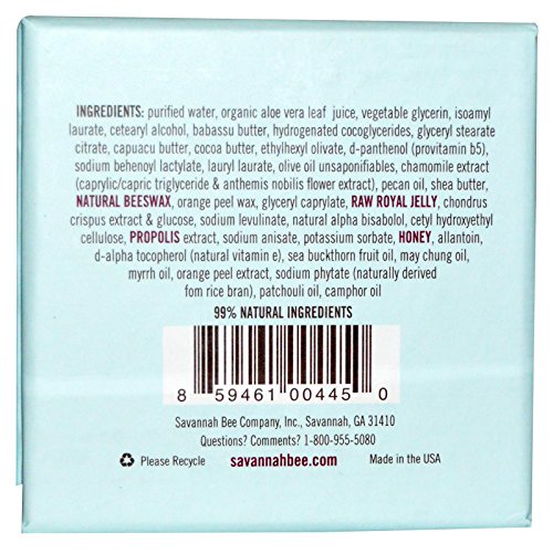 Studio : savannah Publisher : savannah Binding : Misc. Product Description Treat yourself with a moisturizer fit for a queen with Savannah Bee's Royal Jelly Body Butter - Sensitive Skin. This product has four honeybee hive ingredients in it: hydrating honey and beeswax, vitamin rich propolis and the queen bee's treat, royal jelly! Did you know queen bees are fed royal jelly their entire lives and they live up to 1.5 times longer than the worker bees? Other nutrient-rich ingredients in this product include shea butter and cocoa butter, pecan and almond oils, and essential oils from graceful and calming chamomile and myrrh. Use the Royal Jelly Body Butter at any time all over the body for a luxuriously hydrating experience. Savannah Bee offers all-natural, paraben and petroleum free products that are never tested on animals. ||Includes: Body Butter, Moisturizer, Body Cream, Body Lotion ||Used For: Softening, Firming, Anti-aging, Deep Hydration, Soothing, Skin Tone Improvement, Moisturizing ||For Use On: Whole Body ||Product Form: Body Butter ||Scent: chamomile, honey, Unscented ||Health Facts: Sulfate-free, Phthalate-free, artificial color-free, gluten free, Lanolin-free, Oil-free, Talcum-free, Contains Vitamin E, Dye-free, Mineral Oil-free, Petroleum-free, Alcohol-free, labeled paraben-free, sodium lauryl sulfate-free, aluminum chlorohydrate-free ||Health Concern: Dry Skin ||Product Warning: no warning applicable ||Features: Non-irritating, Soothing, Fast-absorbing ||Container Type: Jar ||Made in the USA 0
