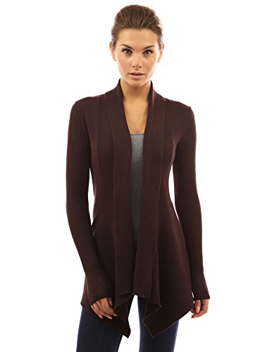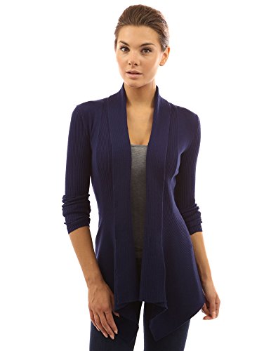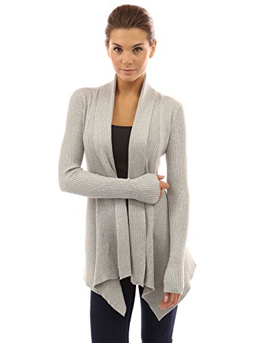 Ribbed Long Sleeve Cascading Asymmetric Hem Open Sweater Cardigan. Model in pictures is 5 feet 8 inches (173cm) tall.