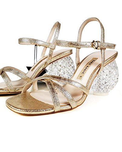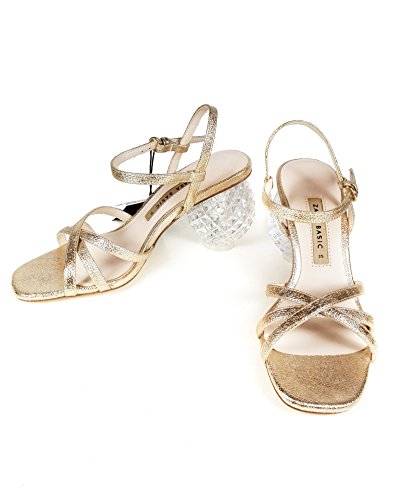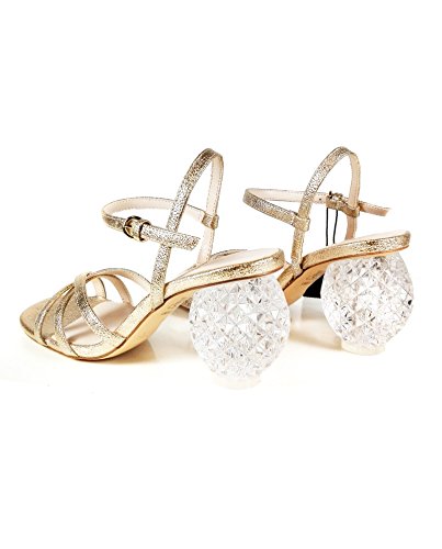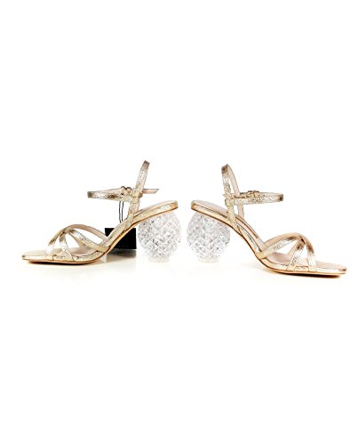 Product Description Gold high heel sandals. Round embossed heel detail. Straps across the instep. Buckled ankle straps. Heel height of 7.5 cm. / 2.9 inches Official brand size equivalence for Women Shoes. Size 35 | USA 5 ? ?|?UK 2 Size 36 | USA 6 ? ?|?UK 3? Size 37 | USA 6.5 |?UK 4? Size 38 | USA 7.5 |?UK 5? Size 39 | USA 8 ? ?|?UK 6 Size 40 | USA 9 ? ?|?UK 7? Size 41 | USA 10 ?|?UK 8? Size 42 | USA 11 ?|?UK 9? Size 43 | USA 12 ?|?UK 10 0