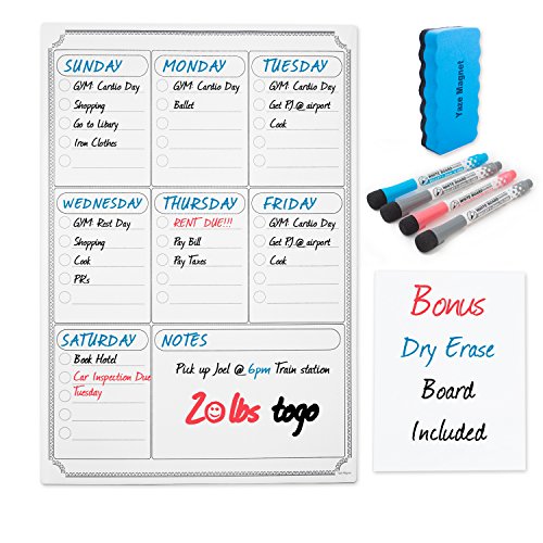 MAGNETIC WEEKLY PLANNER WITH 3 FREE ACCESSORIES – This is the only magnetic weekly calendar that comes with FOUR colorful markers to arrange your notes by color, an extra magnetic eraser that does not leave any residue upon erasing and an extra magnetic white board to help you organize your schedule even more effectively!