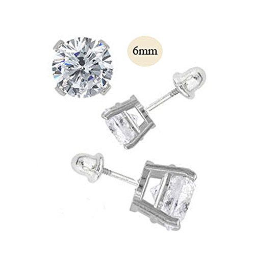 14K White Gold 6mm Round Simulated Diamond Stud Earring Set on High Quality Prong Setting, Screw Back Post