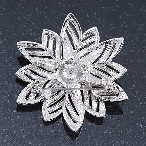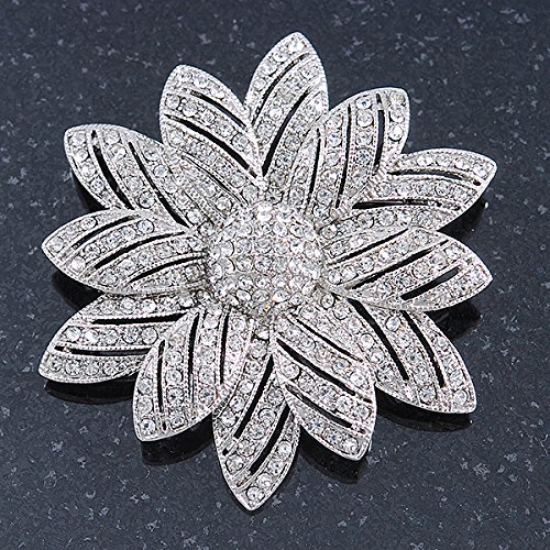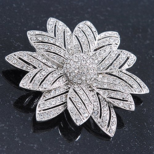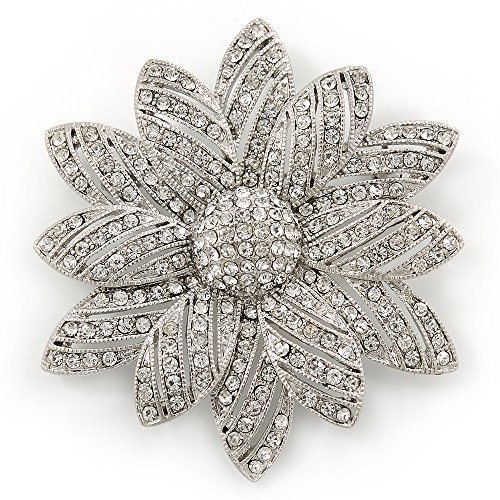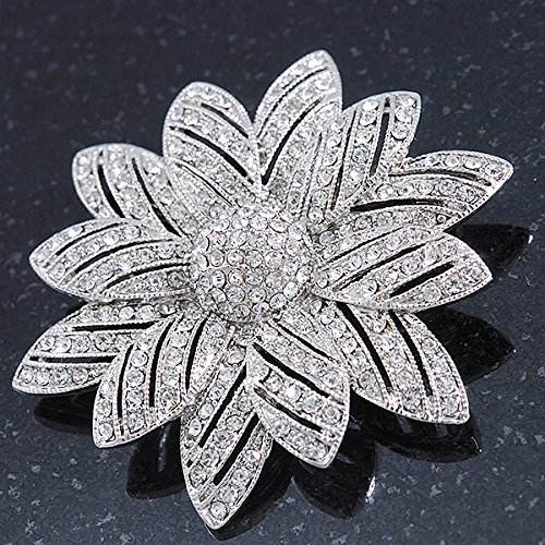 A dramatic statement, this fabulous flower brooch beautifully replicates the timeless glamour of 1940s Hollywood. Featuring a layered flower shaped design literally encrusted with sparkling Swarovski crystals, you could just imagine one of the iconic Silver Screen Starlets wearing this brooch pinned on an extravagant gown. A beautiful 'piece' to wear when the occasion calls for a touch of sparkle, it looks divine pinned on a chic black sweater and coordinated with a pair of simple earrings for a dinner date or, for show stopping style, pin on the hip of a floor length dress for a black tie event. For the star in your life, this would also make an exquisite gift for the costume jewellery addict. Perfect for brides who adore sparkling vintage inspired wedding brooches, this would transform a simple gown into a couture masterpiece. With its flower design, it would add a magical touch to a Winter wedding and also looks sensational pinned into a bouquet. It crafted in rhodium plated metal and measures about 5cm in diameter, fastens with a flag pin and revolver clasp.Feature
