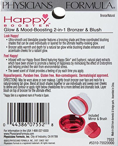 Look Happy. Brush on a radiant blushing glow: Ultra-smooth and blendable powder features a bronzing shade and three coordinated blushing shades that can be used individually or layered for the ultimate healthy-looking glow. Bronzer adds warmth and depth for a natural tan glow while blushing shades enhance and accentuate cheeks for a radiant glow. Experience the mood boosting effect: Infused with our Happy Boost Blend featuring Happy Skin and Euphoryl, natural plant extracts which have been shown to promote a feeling of happiness by mimicking the effect of Endorphins and helping protect the skin from environmental stress. The sweet scent of Violet provides a feeling of joy each time you apply.Feature