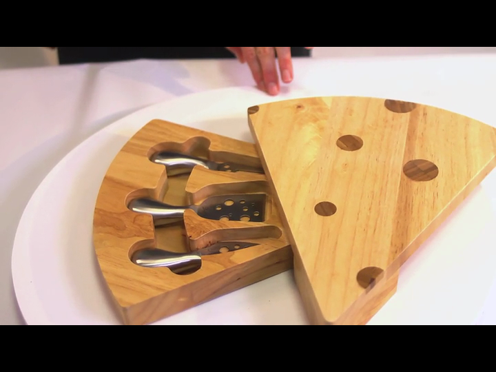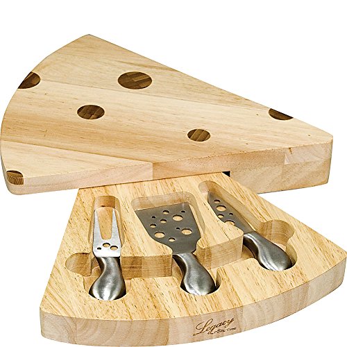 Swivels open to expose three cheese tools: 1 hard cheese knife, a pointed tip cheese knife, and a cheese fork