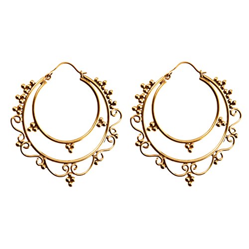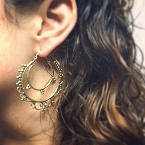 This is a beautiful pair of handmade brass hoop earrings with 2 circles and dotwork design. Suitable for normal pierced ears. Height 57millimetres. Width 55millimetres. Weight 16.5grams.