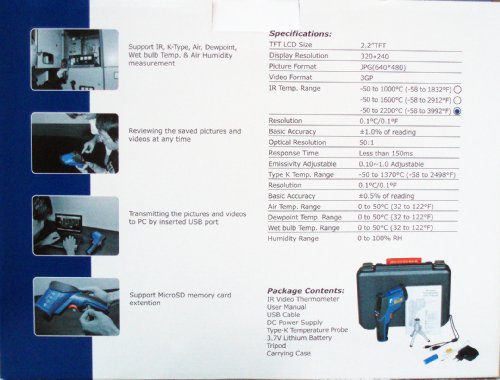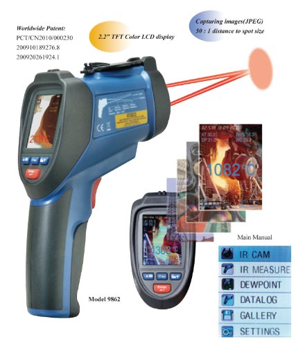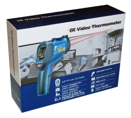 -. Brand : Ruby Electronics -. Color : Gray & Blue -. EAN : 0756006432023 -. Feature : 2.2" TFT 320x240 pixel color LCD display / Built-in 640x480 color digital camera / Easy to use when measuring the temperature of hot or moving objects from a safe distance / Built-in dual laser pointers to improve aim / oC / oF switchable and Auto Power Off ; Auto-Hold after releasing the trigger button -. Label : Ruby Electronics -. Manufacturer : Ruby Electronics -. Model : Ruby Electronics -. MPN : DT-9862 -. PackageQuantity : 1 -. PartNumber : DT-9862 -. ProductGroup : BISS -. ProductTypeName : PRECISION_MEASURING -. Publisher : Ruby Electronics -. Studio : Ruby Electronics -. Title : Ruby Electronics DT-9862 Professional 50:1 IR Dual Laser Video Thermometer up to 3992 deg F 2200 deg C, Type K Thermocouple, Air, Dew Point, Wet Bulb Temp and Air Humidity Meter with Camera and USB Interface -. UPC : 756006432023