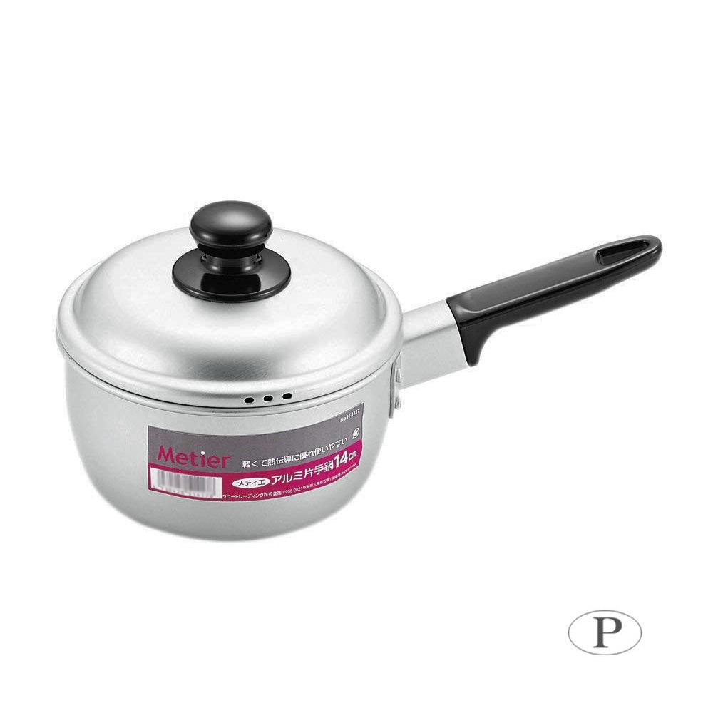 fk094igrjs熱効率に優れたアルミ鍋です  サイズ (約)全長270×幅155×高さ130mm(底の厚さ:0.8mm) 個装サイズ:27×16×13cm 重量 約230g 個装重量:230g 素材・材質 本体・蓋:アルミニウム合金(アルマイト加工) 取っ手・蓋つまみ・座板:フェノール樹脂(耐熱温度150度) 仕様 満水容量:約1100mL ガス火専用 製造国 中国 軽くて使いやすい片手鍋  熱効率に優れたアルミ鍋です