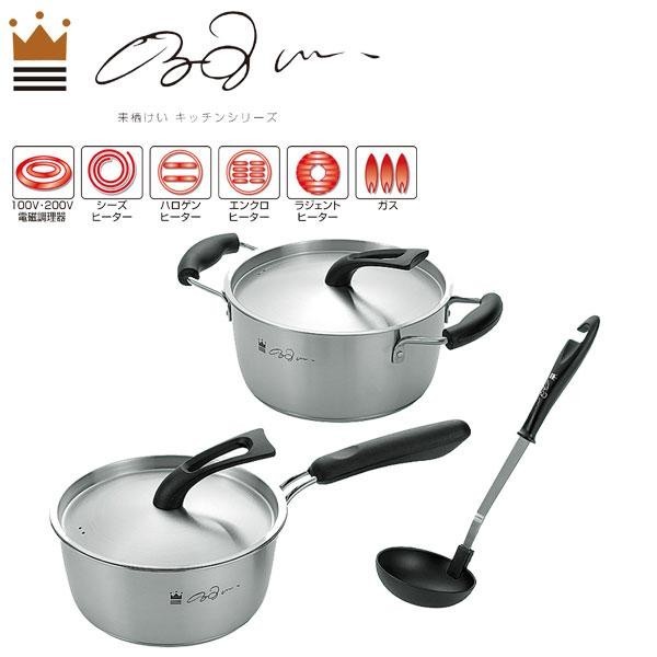 | 素材・材質 | 【片手鍋・両手鍋】 本体:ステンレス鋼(クロム18%、ニッケル8%)(板厚0.6mm) はり底:アルミニウム(板厚2.0mm)+ステンレス鋼(クロム18%)(板厚0.5mm) 蓋:ステンレス鋼(クロム18%、ニッケル8%) 取っ手・蓋ツマミ:フェノール樹脂 取っ手金具:ステンレス鋼 【お玉】 皿部:66ナイロン樹脂 ハンドル部:ポリプロピレン樹脂、ステンレススチール |
