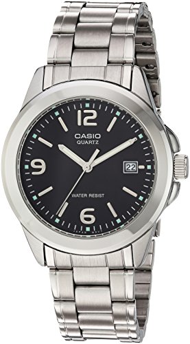 Brand, Seller, or Collection Name:Casio Model number:MTP1215A-1ACR Part Number:MTP1215A-1ACR Item Shape:Round Dial window material type:Mineral Display Type:Analog Clasp:Fold-over-clasp Case material:Stainless steel Case diameter:38 millimeters Case Thickness:9 millimeters Band Material:Stainless steel Band length:Men's Standard Band width:8 millimeters Band Color:Silver Dial color:Black Bezel material:Stainless steel Bezel function:Stationary Calendar:Day Special features:Date Display Movement:Japanese quartz Water resistant depth:165 Feet