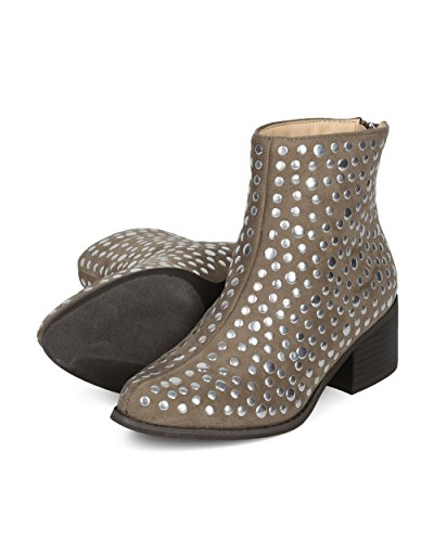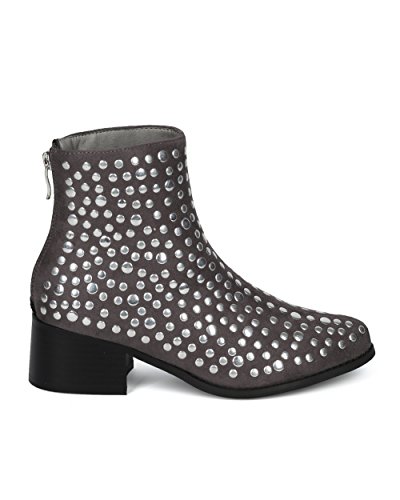 Product Description These spunky booties are full of personality! Made with a faux suede upper, pointy toe and studded details throughout. Also made with a low block heel and hind zip for easy slip on and off. 0