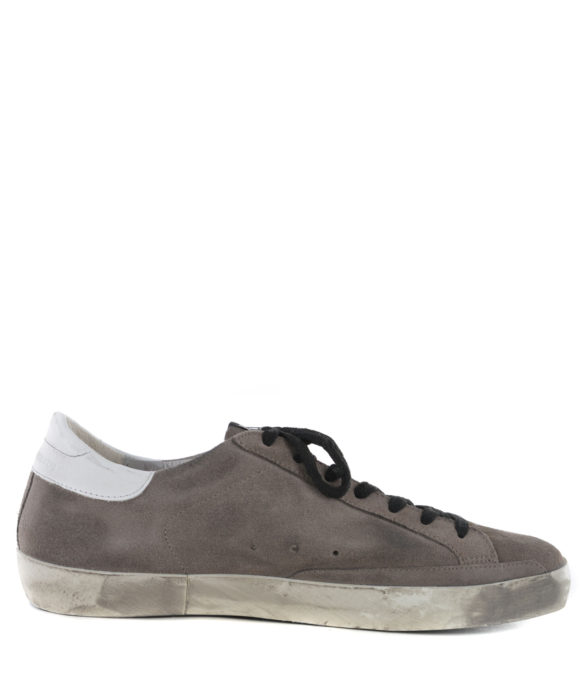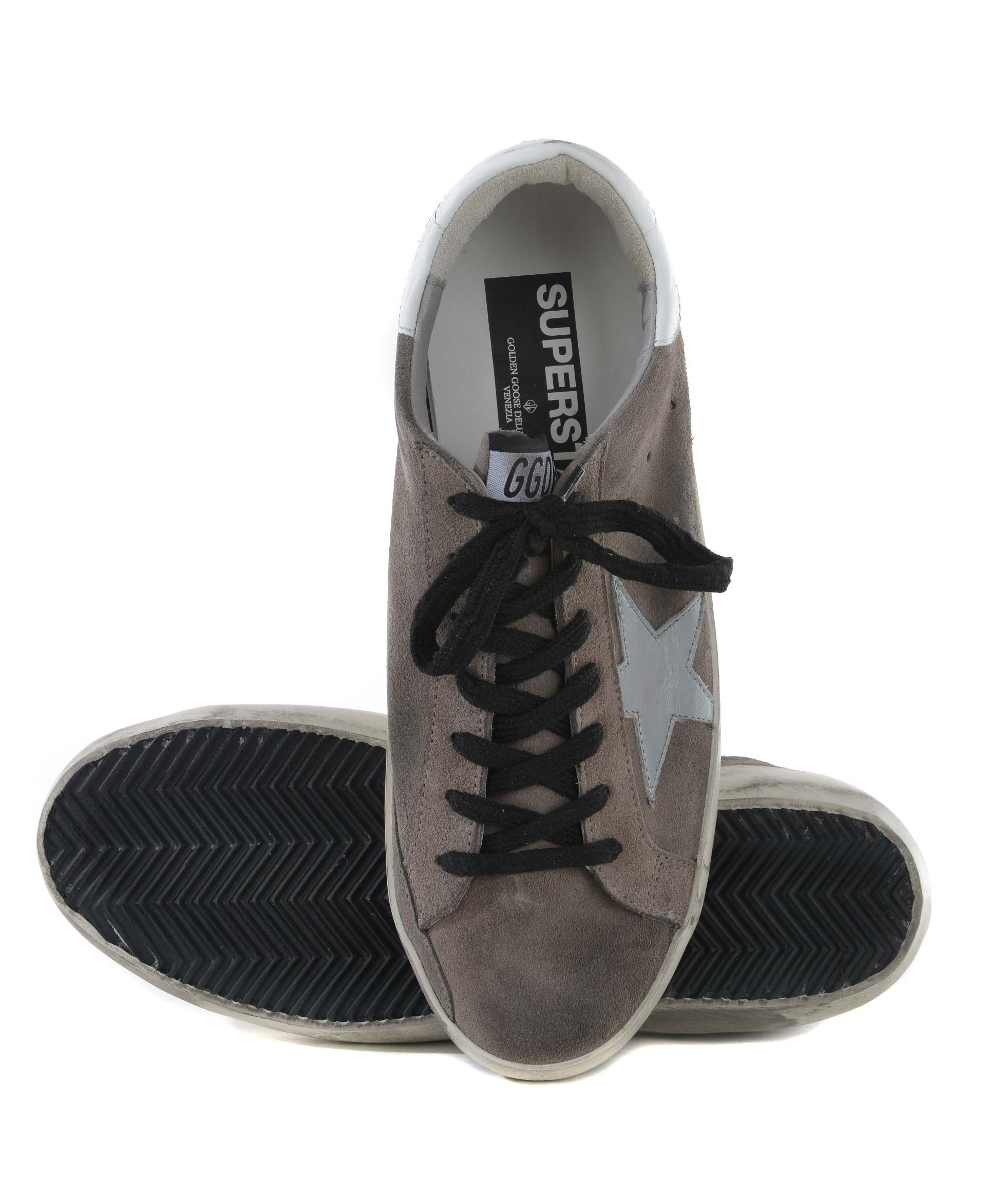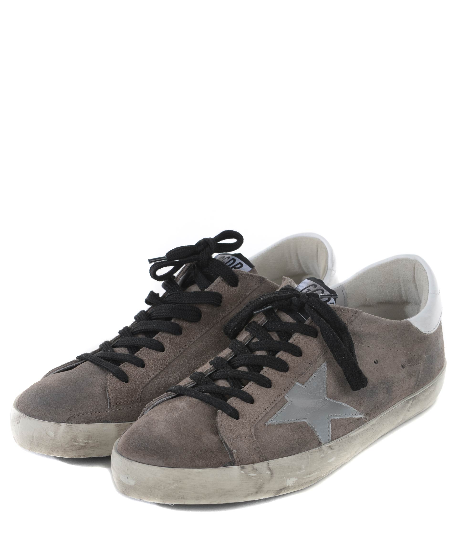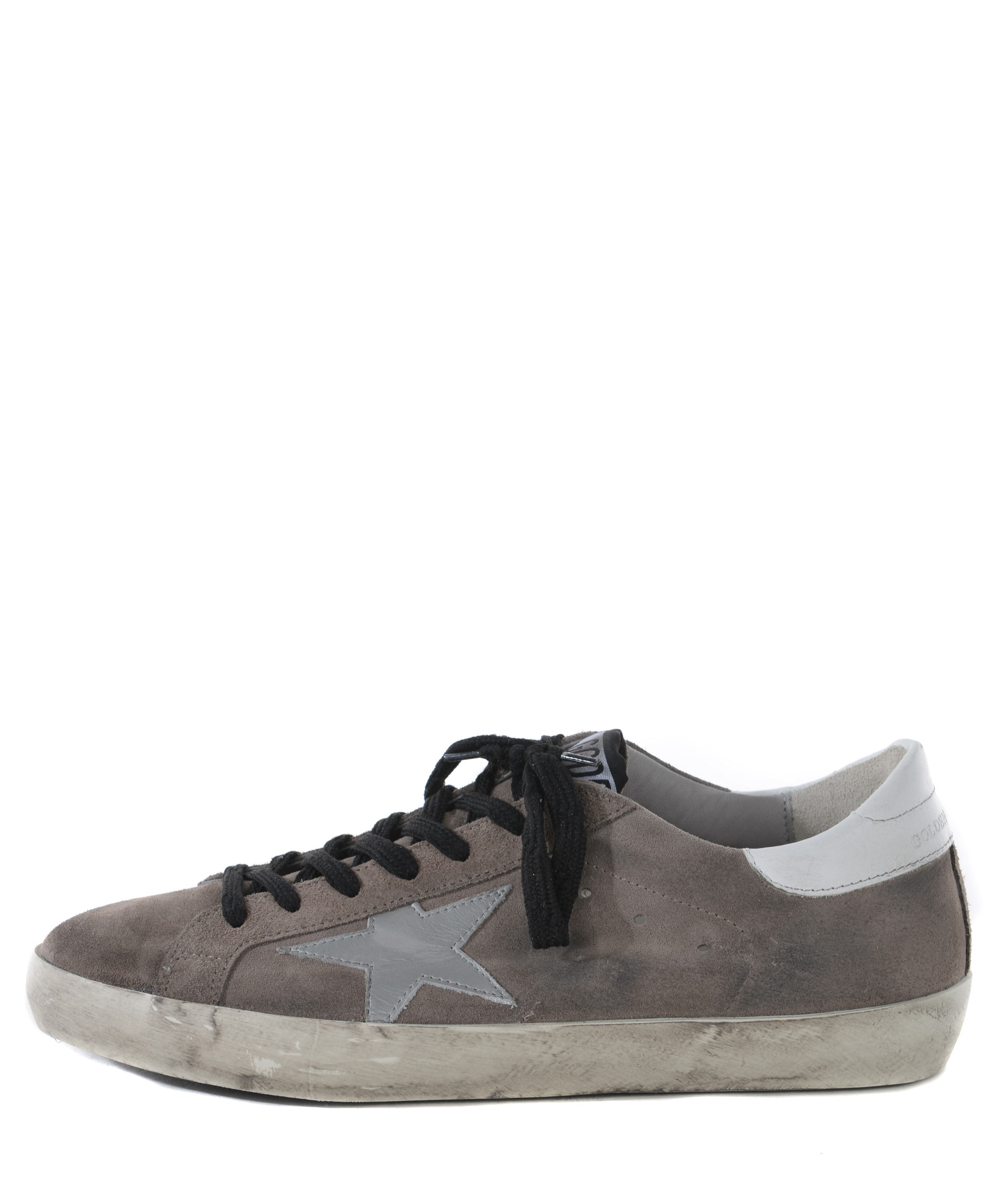 Sneakers Golden Goose in camoscio Tortora. Effetto used. Inserto in pelle sul retro. Stella laterale in pelle argento effetto used. Stringate. Patch logo sulla linguetta. Suola in gomma super vintage. Misura in foto 40