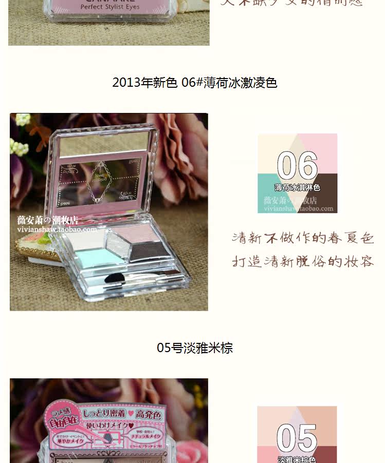 五色组合,内含一个眼影棒01号SWEET粉色系02号婴儿米色03号珊瑚粉色系(小腻腻推荐色)04号珊瑚粉棕色(新色)05号淡雅米棕 新出颜色 清新优雅06号薄荷冰激凌-清新奶绿色(新色)最新发布:07号红莓蛋糕色 08号美人鱼蓝色