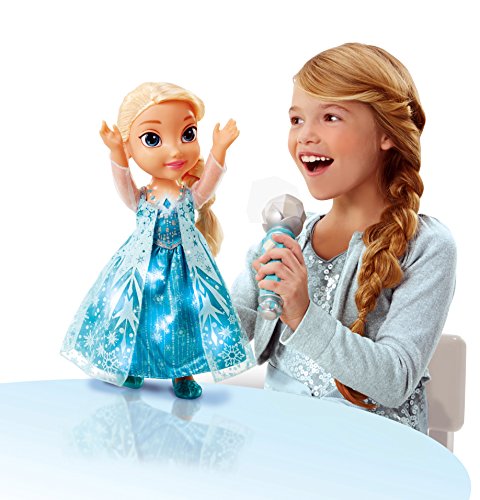-. Binding : Toy -. Brand : Frozen -. EAN : 0781624536068 -. Feature : Use the real working microphone to start singing the FULL-LENGTH movie version of "Let it Go" / Place the microphone in front of Elsa and she'll pick up where you left off! Pass the mic back and forth to create the perfect duet! / Elsa says 15+ magical phrases and sings in English & Spanish / Elsa's dress and necklace magically lights up! -. IsAdultProduct : 0 -. ItemPartNumber : 31078 -. Label : Jakks -. Manufacturer : Jakks -. Model : 31078 -. MPN : 31078 -. PackageQuantity : 1 -. PartNumber : 31078 -. ProductGroup : Toy -. ProductTypeName : TOYS_AND_GAMES -. Publisher : Jakks -. Studio : Jakks -. Title : Frozen Sing-A-Long Elsa Doll -. UPC : 678352310780 -. Warranty : No Warranty Create the perfect duet with Elsa! The magical microphone can recognize who's singing so you and Elsa can Sing-A-Long together! First, place the microphone near Elsa's mouth to hear her sing the FULL LENGTH award winning song "Let it Go," then start singing your favorite part with the Mic and have Elsa pick up where you leave off! Pass the microphone back and forth to create the perfect duet and watch Elsa's necklace and dress light up as you Sing-A-Long to create a magical winter wonderland. Elsa is dressed in her iconic Snow Queen dress. Includes: Toddler Doll, Real Working Microphone, Shoes, Batteries.
