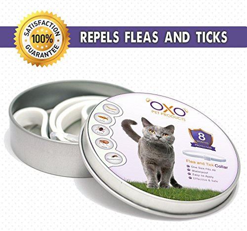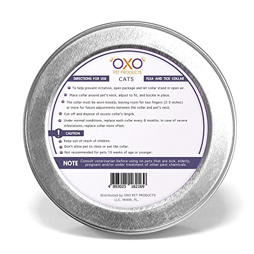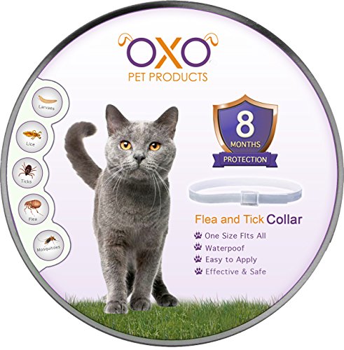 OXO PET PRODUCTS Flea And Tick For Cats Collar: The OXO Pet Products cats flea tick prevention collar can repel fleas and ticks and other common pests including mosquitoes, lice and larvae for as long as 8 months. This cat flea tick prevention collar is a treatment and prevention in one easy step, effectively and reliably helping to keep your cat safe without harmful infections caused by pests. User Guide: 1) Place collar around cat's neck, adjust for fit (it's better to leave 2 or 3 inches for extra adjustment) and buckle in place. 2) The collar should be worn loosely to allow it move around the neck. You may cut off the excess length. 3) Under normal conditions, replace each collar every 8 months. 4) Under abnormal conditions, for example, swimming or advanced infestations collar should be replaced more often for better results. ATTENTION: - This cat tick collar is waterproof, however exposing it to water will decrease its strength. -Appropriate Age: Users are advised start use when cat is over 10 weeks old. - This flea collar for cats is suitable for most cats, however if you find your cat has allergies, please consult with your vet. NOTE: make sure you exterminate fleas in your home and shampoo your pet before applying for accurate results. Fleas and ticks reproduce at a very rapid pace, all these steps should be taken care of to solve the pest issue accurately. 0