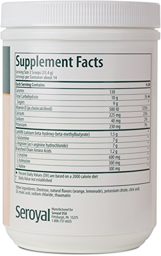 HMB Complex 10.9 oz AMINO ACID SUPPLEMENT Natural Orange Flavor Recommended Adult Dose: In a glass add 250 ml of water or juice to two scoops of HMB Complex and mix. Take once daily with a meal or as recommended by your healthcare practitioner. Risk Information: If you have had a heart attack/myocardial infarction do not use. If you are pregnant or breastfeeding consult your healthcare practitioner prior to use. Some people may experience gastrointestinal discomfort. Supplement Facts Serving Size 2 Scoops (22 g) Servings per Container about 14 Each Serving Contains Calories 20 Sodium 50 mg Total Carbohydrate 3 g Sugars 2 g Calcium 225 mg Vitamin D (cholecalciferol) 500 IU CaHMB (calcium beta-hydroxy-beta-methylbutyrate) 1.5 g L-Glutamine 7 g L-Arginine (l-arginine hydrochloride) 7 g Branched Chain Amino Acids 1.2 g L-Leucine 600 mg L-Isoleucine 300 mg L-Valine 300 mg Other ingredients: Natural flavors potassium citrate citric acid sodium chloride thaumatin. Guaranteed to contain no added wheat yeast gluten soy artificial coloring or flavoring or dairy products. Ideal for vegetarians. Quality Assurance: Safety-sealed for your protection and for product freshness. Do not use if outer seal is missing or broken. Store in a cool dry place.
