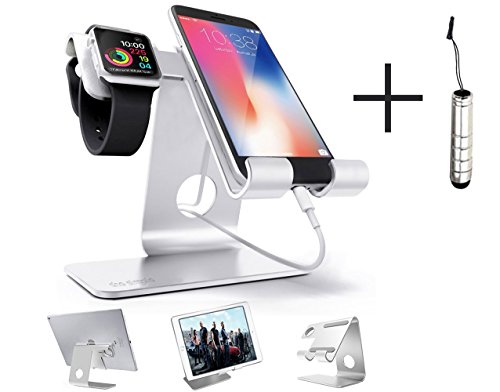 -. Feature : THE SIMPLE Sleek Stylish 2 in 1 Silver aluminum desktop cell phone stand is universal perfectly compatible with as majority of smartphones,like iPhone 6 6S 7 8 X Plus, HUAWEI, Galaxy S7 S6 S8,tablets and e-readers,although with case / phone stand perfect for desk or table to watch movies, read etc (both horizontal & vertical). sync charging your phone or tablets . Angled Support for Facetime / Iphone stand made of highest quality solid aluminum,Rubber pads and feet protect your device from scratches and sliding, Durable body weighs only 250 grams. / LIFETIME GUARANTEE: The iphone stand includes a 30 days money back &18-month warranty. Offering you a full refund or a brand new replacement if you are not satisfied with it.