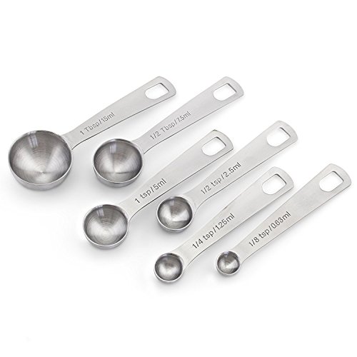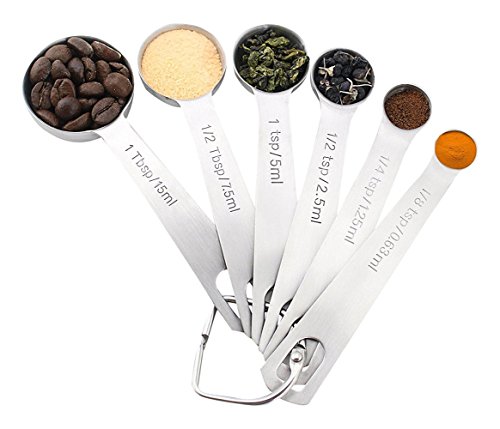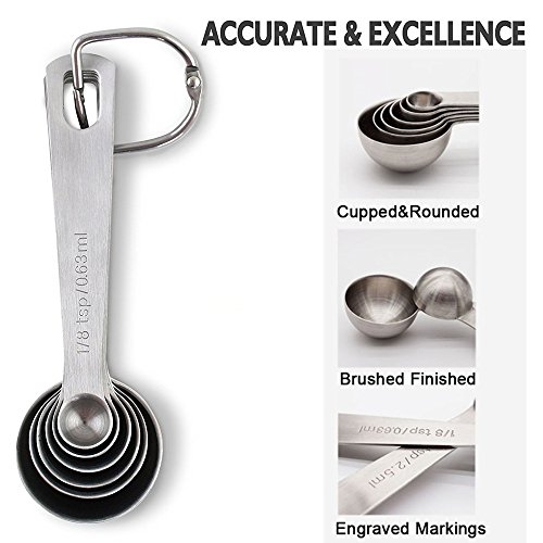 - PRACTICAL DESIGN: Round-shape spoon heads and perfectly weighted handles. Set Contains 6 spoons: 1/8-tsp, 1/4-tsp, 1/2-tsp, 1-tsp, 1/2-Tbsp. and 1-Tbsp and conveniently connected by a unique D-shape ring which helps to keep the spoons together after a full day of baking or cooking. With each measurement is engraved on the handle of each spoon, there's no guesswork when adding spices to your dishes.