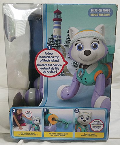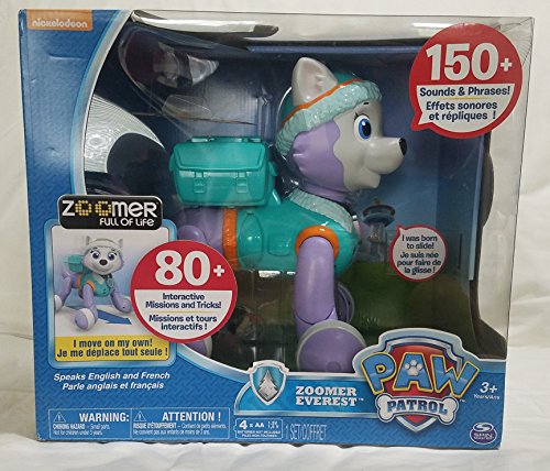 Meet Paw Patrol’s Zoomer Everest! This interactive pup really comes to life: walking, talking, spinning, and more, all on her own! With the wave of your hand, you can get her to follow you, just like a real pup! Press down on her head to make her say over 150+ real Paw Patrol phrases and sounds! She’ll even perform the Pup Pup Boogie and the Paw Patrol Theme! Ice or snow, are you ready to go? Zoomer Everest has 80+ interactive missions and tricks. Join her on Paw Patrol missions and use her transforming Pup Pack and extendable grappling hook to save the day! Through bravery, imagination and team work, you can be the hero of Adventure Bay with Paw Patrol Zoomer Everest!Feature
