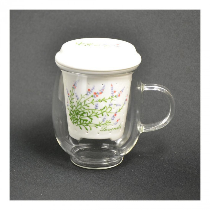 ガラスのマグカップに陶磁器の茶こしと蓋をセットしました。茶こしは底部が三つ脚になっており、マグカップに茶こしの脚を引っ掛け、熱いお茶の湯切りをすることができます。蓋は裏返すと茶こし受けとしてもご使用いただけます。ギフトにも最適♪ |