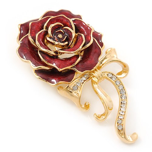 -. Title : Burgundy Red Enamel Rose With Crystal Bow In Gold Plating - 65mm Length