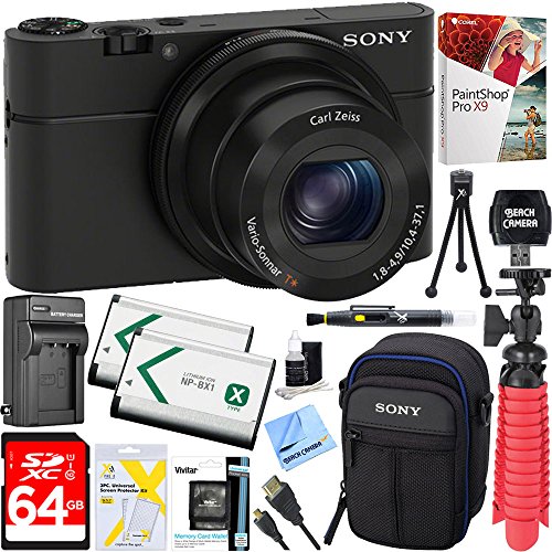 BUNDLE INCLUDES: Soft Carrying Case for Cyber-shot Digital Cameras - 64GB Class 10 UHS-1 SDXC Memory Card - 2 x NP-BX1 Extra Battery Pack and Charger - Corel PaintShop Pro X9 - 12-inch Rubberized Spider Tripod - LCD/Lens Cleaning Pen - SD Memory Card Reader - Tri-fold Memory Card Wallet - LCD Screen Protectors - Mini Tabletop Tripod - 3 Piece Lens Cleaning Kit - Beach Camera Microfiber Cleaning Cloth