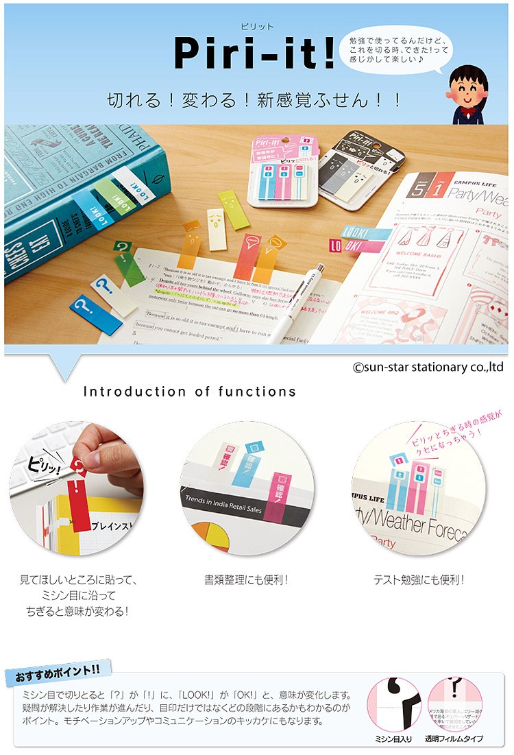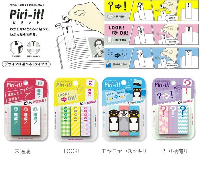 第18回文房具アイデアコンテスト」にて「審査員特別賞」受賞商品! ふせん上部のミシン目を切ると、『LOOK!』が『OK!』に変化する仕組みとなっており、学校やオフィスで幅広く使用できます。 使用例としては、「教科書や書類の疑問点にふせんを貼り、解決したら"ピリッ"と切り離す」など、自分の成長が可視化できるのの特徴です。 様々な場面で活躍できる、新感覚の付箋です。