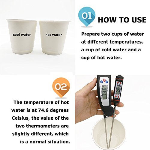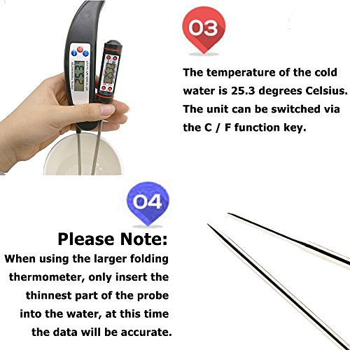 NOTICE: For the folding thermometer, please use the thinnest part of the probe to measure the temperature in order to get accurate data. The smaller one come with one AG13 (LR44) battery, but the bigger one DOESN'T (powered by AAA battery).