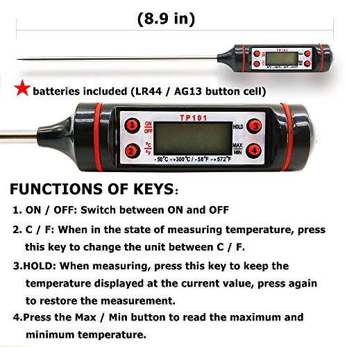 FUNCTION KEYS: There are 4 keys on the smaller thermometer and 3 keys on the bigger one. Use the HOLD button to keep the degree after you have measured the temperature, if not it will change once the probe leave the food.