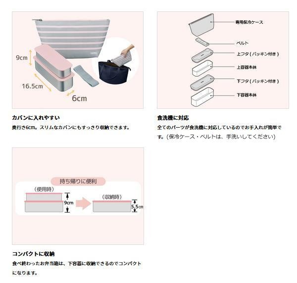 | 仕様 | 二段式 容量:上容器230ml/下容器405ml 食洗機使用可 電子レンジ使用不可 保冷ケース・ベルト:手洗い |