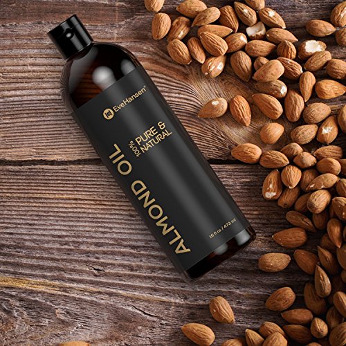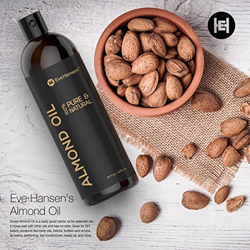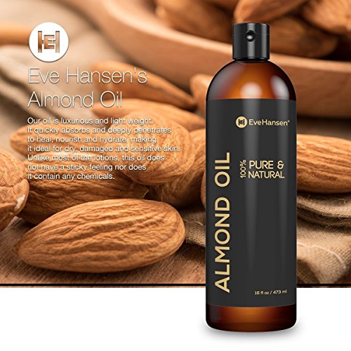 NATURAL ALMOND OIL HAIR VEGAN WRINKLE REMOVER: skin oil eye area irritation. HIGH QUALITY sweet oil, almond carrier oil & skin moisturizer. Eve Hansen's sweet almond oil organic unrefined is 100% pure cold pressed almond oil from sweet almond tree, prunus dulcis, known for their aroma. ANTIOXIDANTS AND VITAMINS in pure almond oil lotion, no additives, lessens rashes and hair loss. Our sweet almond oil is anti aging powerhouse! Use confidently & comfortably as almond extract is the only ingredient. This liquid moisturizer and almond oil conditioner helps heal dry, cracked, damaged hair, skin, nails and soothe other skin conditions. Can Blend sweet almond oil for hair with other essential oils or simply use on its own for a therapeutic experience. Skin oil therapy Sweet almond oil organic unrefined is lightweight. It absorbs quickly & penetrates to nourish and hydrate, making it ideal for dry, damaged, and sensitive skin. Unlike most other oils and lotions, this oil does not leave behind a sticky and greasy residue, nor does it contain any chemicals. Sweet Almond oil is a massage oil that relieves muscle pain & stress. Our oil also makes the ideal carrier oil for essential oil use. Almond oil massage oil's uses, besides a skin therapy lotion oil, is its ability to reduce the appearance of dark circles. Hexane Free Almond oil is an emollient, known for calming and moisturizing the skin and provides a large amount of nourishment to desired areas. In addition to relief from dry skin, brittle, think nails, psoriasis, eczema, others have reported using Sweet Almond Oil for face reducing wrinkles and fine lines and great as a baby oil. Almond oil acts as a cleansing oil to prevent clogged pores & blackheads. Our almond oil cold pressed oil is Gentle & safe for all skin types. Use sweet almond oil extract in home lotions, butter, scrubs, lip balm, perfumes, organic shampoo, hair moisturizers. ALMOND OIL MOISTURIZER, hair treatment, massage oil & dry skin treatment.Feature