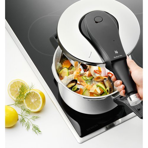 TÜV geprüfte Sicherheit: Abdampfautomatik und Restdrucksicherung gewährleisten Sicherheit beim Öffnen. Made in Germany - Premium-Qualität, hergestellt in Eigenproduktion in Deutschland. 3 Jahre Garantie auf alle WMF Schnellkochtöpfe.