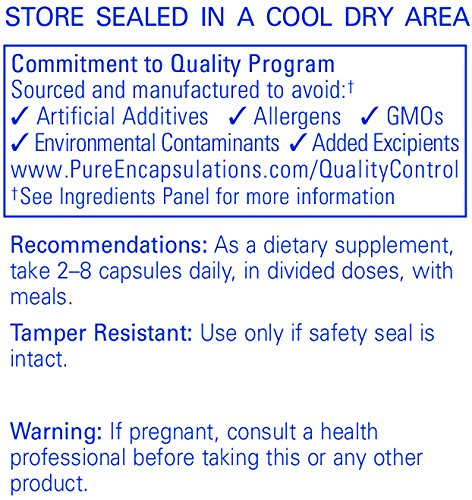 FREE FROM: Pure Encapsulations products are free from wheat, gluten, egg, peanuts, magnesium stearate, hydrogenated fat, artificial sweeteners and colors, and other unnecessary excipients. Any product containing ingredients derived from allergens, such as soy, dairy or shellfish is clearly labeled. * These statements have not been evaluated by the Food and Drug Administration. This product is not intended to diagnose, treat, cure, or prevent any disease.
