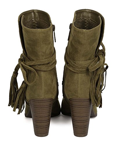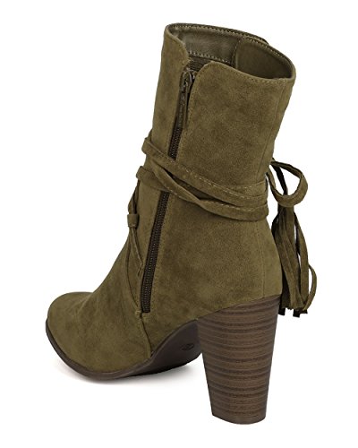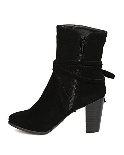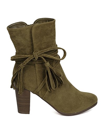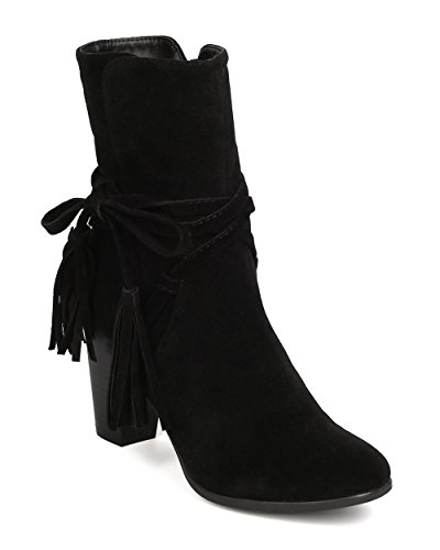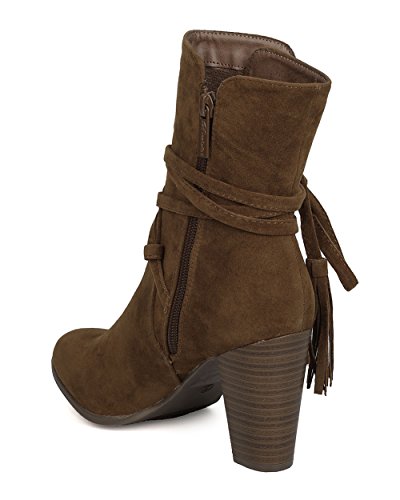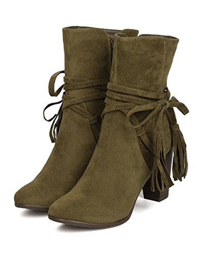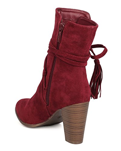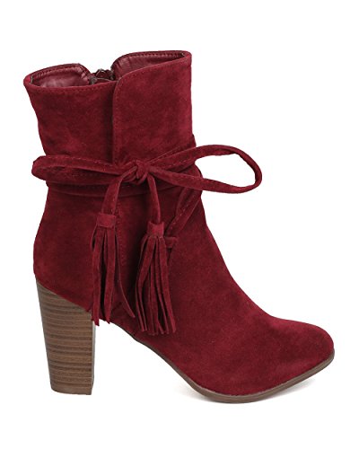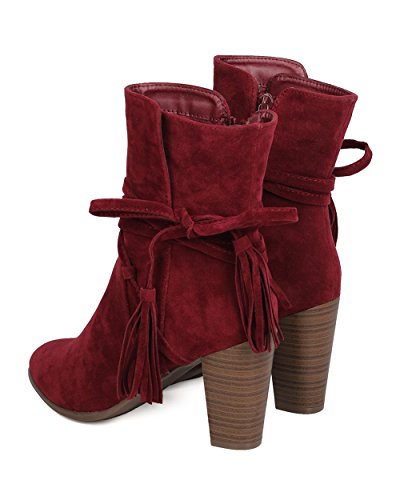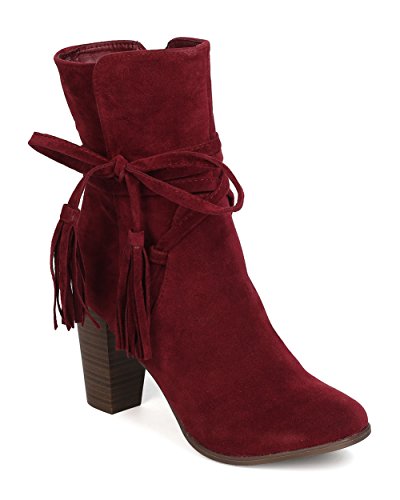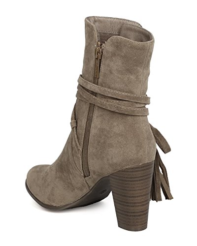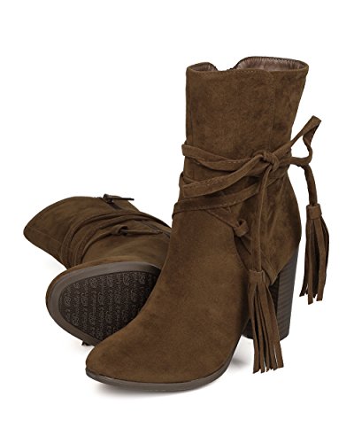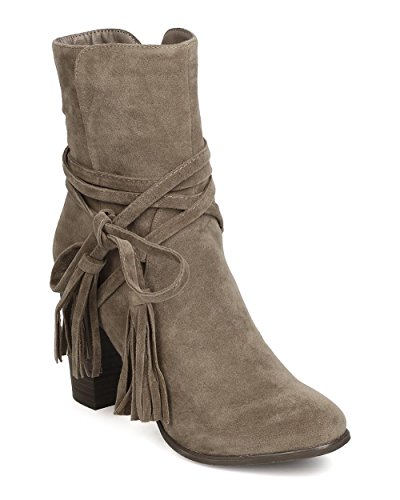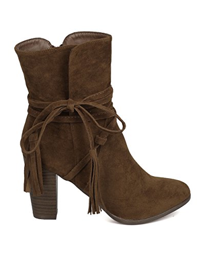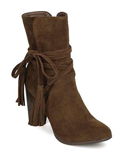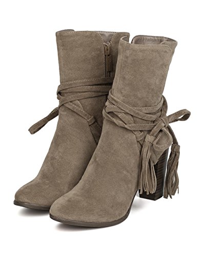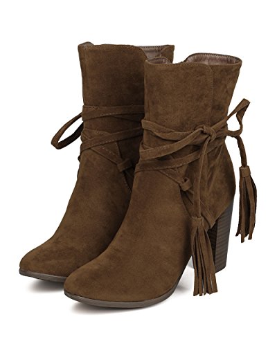 Breckelles GA27 Women Faux Suede Wraparound Tassel Chunky Heel Bootie