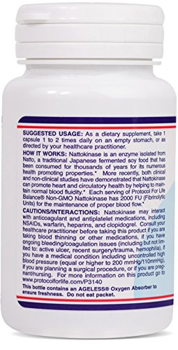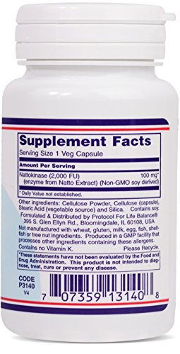 HOW IT WORKS: Nattokinase is an enzyme isolated from Natto, a traditional Japanese fermented soy food. Natto has been consumed safely for thousands of years for its numerous health benefits. More recently, both clinical and non-clinical studies have demonstrated that Nattokinase supports heart health and supports healthy circulation. Each serving of Nattokinase provides 2000 FU (Fibrinolytic Units) to help keep already healthy levels of blood clotting factors within a normal range.*Protocol For Life Balance® is an A-rated GMP manufacturer of pharmaceutical grade dietary supplements created for healthcare practitioners. Our product line is comprised of effective, science-based formulations intended to address common nutrient deficiencies and support healthy physiological function. These formulations are based on the latest advances in nutritional science and incorporate trademarked ingredients of the highest quality. Our serving sizes are based on doses used in clinical trials and other published data, and the ingredients used in our products have been tested for efficacy in clinical trials and laboratory studies.