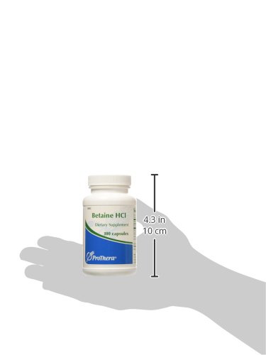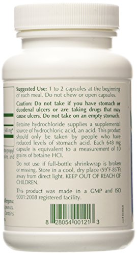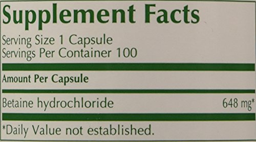 Betaine hydrochloride promotes optimal gastric acidity to support protein digestion and absorption of minerals and other nutrients. This compound provides a supplemental source of hydrochloric acid, an acidifying compound normally produced by the stomach during digestion of foods. This product should only be taken by people who have reduced levels of stomach acid. Each 648 mg capsule is equivalent to a measurement of 10 grains.