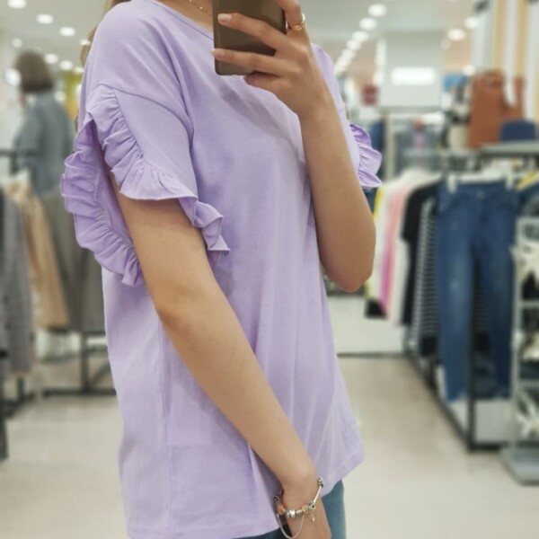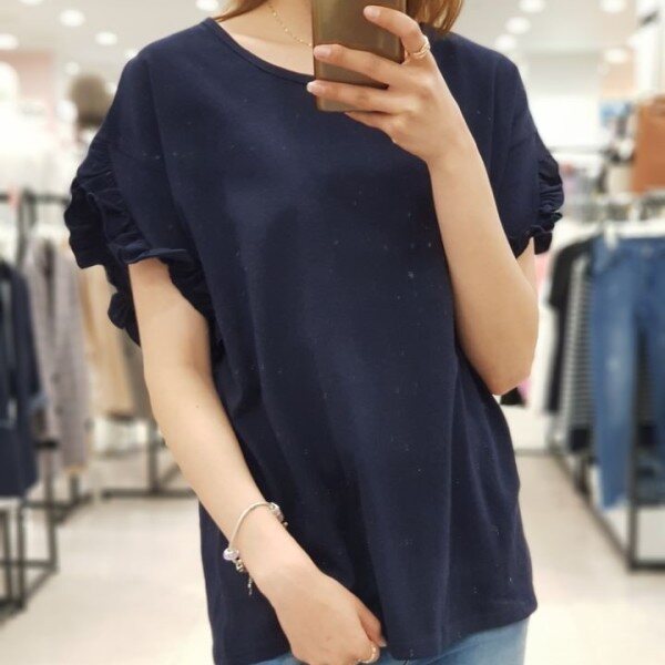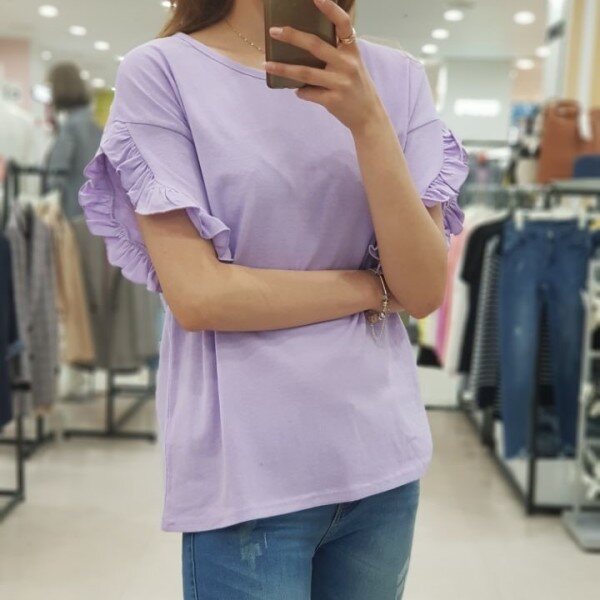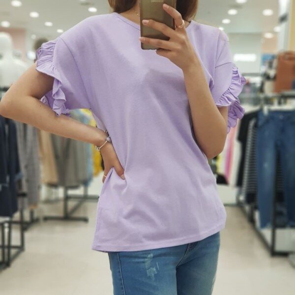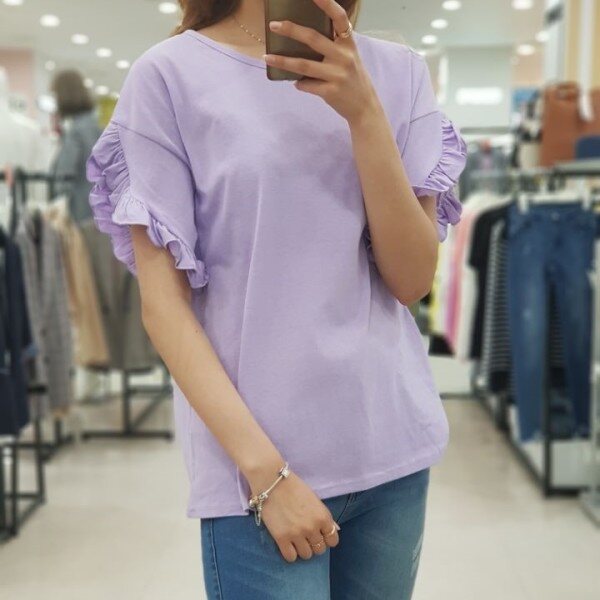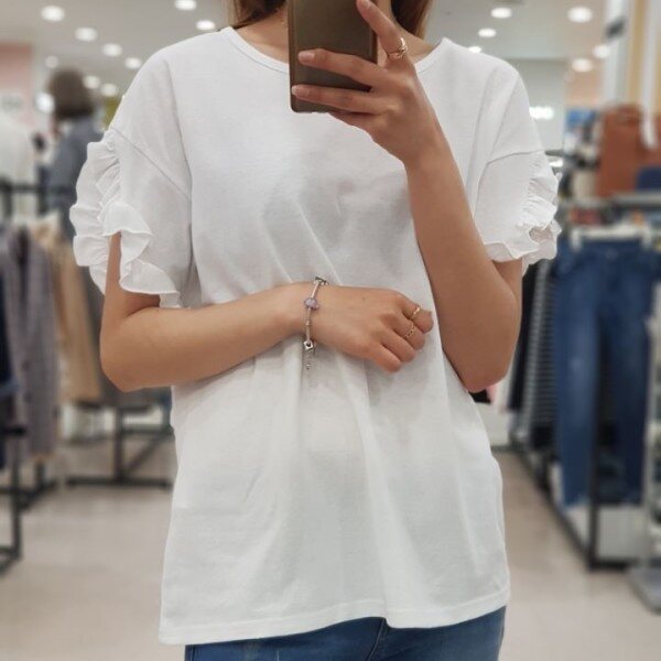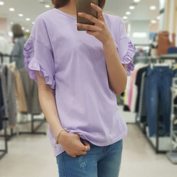소매라인을 따라 예쁘게 펼처진 프릴이 러블리함을 더해주는 ab.f.z 티셔츠 입니다.포인트 상품으로 입기 좋으며 원피스, 치마, 청바지 등 레이어드해서 입기 좋은 상품입니다.연보라, 화이트, 네이비 3가지 색상입니다.