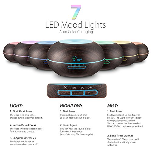 - ★ Mist mode: Continuous /Slight/Intermittent /. 4 timing mode: 1 hour/2 hour/3 hour/unlimited time. 7 colors of LED lights, adjustable, the colors can be showed in cycle, or only show one particular color. Brightness is also adjustable, which attributes to a more colorful night.