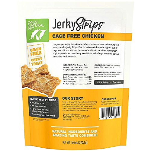 -. Feature : MADE IN THE USA from USA sourced, cage free chicken raised without added hormones or antibiotics. Naturally healthy and delicious, chicken is high in protein. / REAL MEAT TREATS give your dog a delicious meat taste and hearty, chewy texture that offers a satisfying snack or can be broken into pieces for a high reward training treat. / GRAIN FREE & ALL-NATURAL chicken jerky strips are healthy for your dog and contain only natural ingredients - no artificial colors, flavors or preservatives. / SINGLE PROTEIN cage free chicken makes a delightfully delicious treat that is ideal for dogs with food sensitivities, especially to common ingredients like beef and grains. / SATISFACTION GUARANTEE - Only Natural Pet products always include a 100% Satisfaction Guarantee. Only Natural Pet uses only the highest quality ingredients in our recipes. Providing you & your pet the highest quality products is our top P.R.Iority.