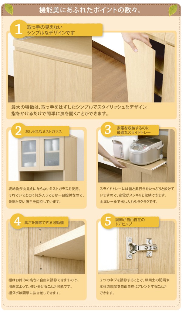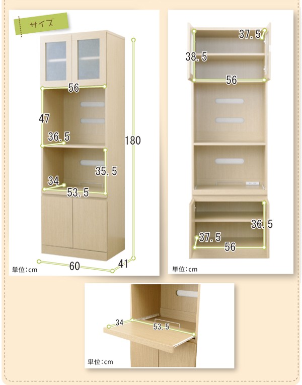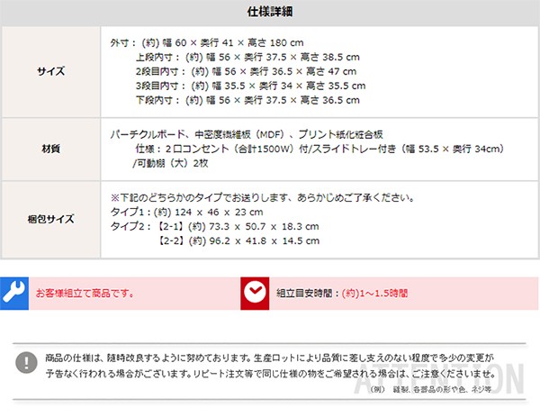 【商品について】サイズ■[最大外寸]幅60×奥行41×高さ180cm■[上段内寸]幅56×奥行38.5×高さ37.5cm■[2段目内寸]幅56×奥行36.5×高さ47cm■[3段目内寸]幅35.5×奥行34×高さ35.5cm(2杯)■[下段内寸]幅56×奥行37.5×高さ36.5cm■カラーナチュラルホワイト■仕様二口コンセント(合計1500W)付き■スライドトレー付き(幅53.5×奥行き34cm)■可動棚(大)2枚付き■生産国:中国製【その他】■お客様組立品■重量のある商品のため、二人以上で組み立てをされる事をお勧めいたします。 ※メーカー直送品、商品代引き不可