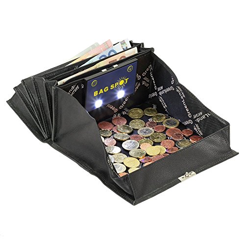 -. Binding : Textilien -. Brand : Ledershop24 -. Color : Schwarz -. EAN : 4250625801575 -. Feature : klein und handlich - 2 super helle weiße LED - Brenndauer bis zu 72 Stunden / Kunststoff mit Metallbügel zum Einstecken in Kellnerbörse oder Anbringung am Gürtel / Einstellbarer Leuchtintervall von 5 bis 35 Sekunden - die Helligkeit der LED Lampen ist einstellbar / die im Lieferumfang enthaltenen Knopfzellen sind auswechselbar und halten bis zu 72 Leuchtstunden / durch drücken des Knopfes sorgen die kleinen Lampen ca. (7 Sekunden voreingestellt) lang für eine helle Beleuchtung -. IsAdultProduct : 0 -. ProductGroup : Shoes -. ProductTypeName : SHOES -. Size : Breite 9 cm Höhe 5,5 cm Tiefe 0,5 cm -. Title : LED Licht Bag Spot für Kellnerbörse Kellner Kellnergeldbörse Geldbörse Kellnergeldbeutel Bedienungsbörse Damentasche Handtasche Tasche