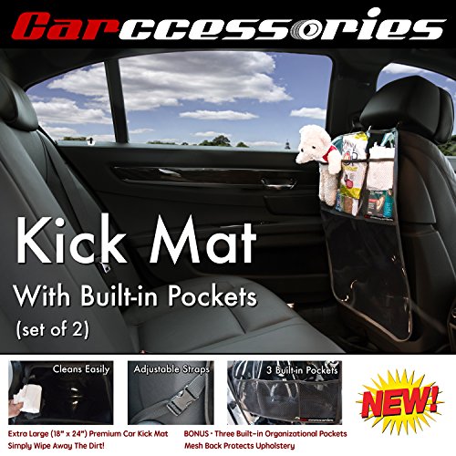 - Feature : SET OF TWO EXTRA LARGE (18" x 24") car kick mats will protect the back of seats against footprints, dirt, snow, mud, water, grime, and misc. / TWO PREMIUM ADJUSTABLE BUCKLES allow you to get the perfect fit on both the driver and passenger seat in sedans, SUVs, and vans! / THE FRONT OF THE SEAT BACK COVER, made from an easily cleanable, durable, water resistant, and flexible vinyl material. / THE BACK OF THIS AUTO SEAT BACK PROTECTOR, made from durable soft mesh that will not scratch, leave scuff marks, or ruin the upholstery of your vehicle. / BONUS: Built-in organizer with 3 pockets gives both kids and parents a quick way to organize easy to reach essentials.