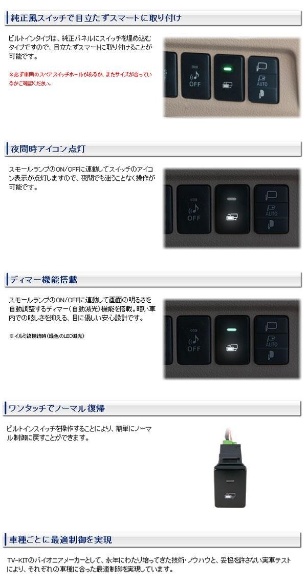 | セット内容 | TV-KIT本体 ビルトインスイッチ スイッチハーネス E-クランプ 両面テープ 取扱/取付説明書 保証書(保証期間:1年、ユーザー保証登録カード付属) |