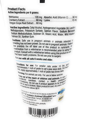 -. Feature : 21st Century Uri-EZE Paw Paste for cats is recommended as a good tasting and convenient way to support your cat's urinary tract health. / Used For: Cats over six weeks / Health Consideration: Urinary Tract / Size: 3.0 oz / Directions: Do not use in pregnant animals- Ingredients: Canola Oil, Carbomer, Cetyl Alcohol, Dissodium EDTA, Ethylhexylglycerin, Flavor, Glycerin USP, Glyceryl Stearate, Glyceryl Stearate SE, Helianthus Annuus (Sunflower) Seed Oil, Hydroxylated Lecithin PEG-100 Stearate, Phenoxyethanol, Polysorbate 60, Probiotic, Xantham Gum