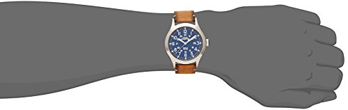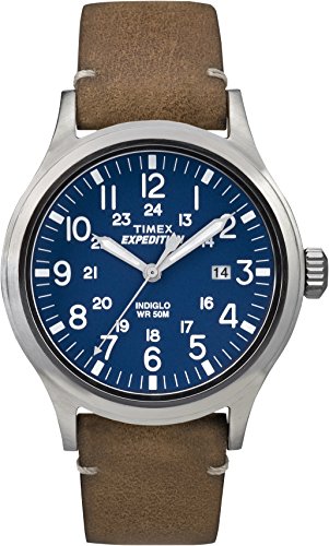 -. Feature : Men's Timex Expedition Scout Watch collection. / Stainless steel case. Tan leather strap. Blue dial. Date display. / INDIGLO® Night-Light. / Case size: 40 mm. Case thickness: 10 mm. / Scratch resistant: Mineral Crystal. Water Resistant: 50 meters / 165 feet.