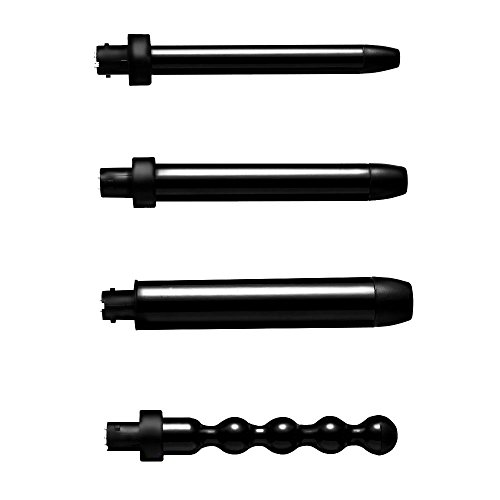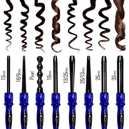 - 8 INTERCHANGEABLE BARRELS with lock system. Sizes: 13mm (1/2 of an inch), 19mm (3/4 of an inch), 25mm (1 inch), 32mm (1 1/4 inches), 18/9mm (3/4-3/8 of an inch), 25/13mm (1-1/2 inches), 13/25mm (1/2-1 inches), Pearl. Each barrel will create a different type of curl: tight perm curls, ringlet curls, spirals curls, ribbon curls, flick curls, large and bouncy curls, beach or wavy curls and finger wave type curls that will hold for ages