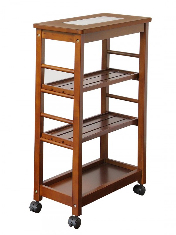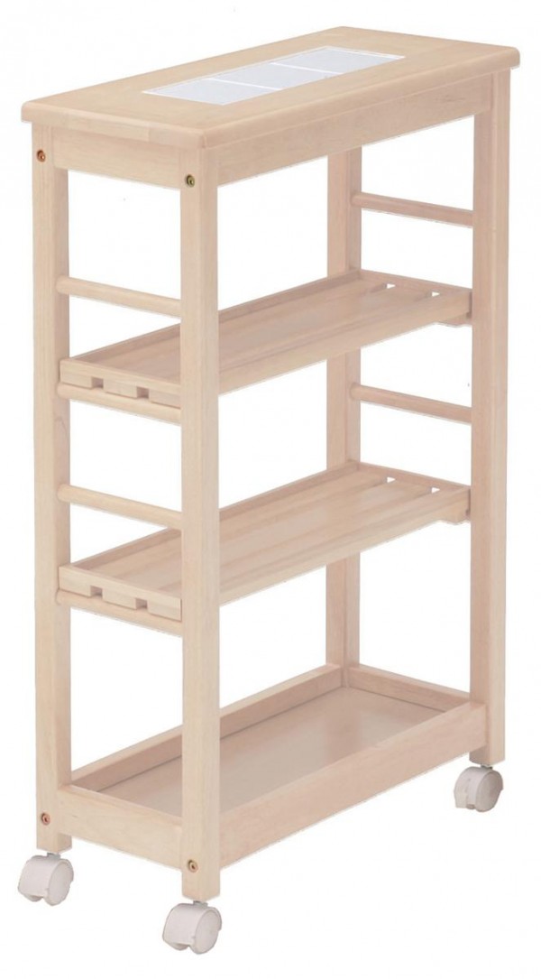 天然木のキャスター付、25cmのキッチンの隙間に収まるスリムな収納ワゴンです。システムキッチンと同じ高さの85cmのタイプです、隙間収納ワゴンを有効にご活用ください。天板の一部は熱に強いタイルの仕様になっています。 |